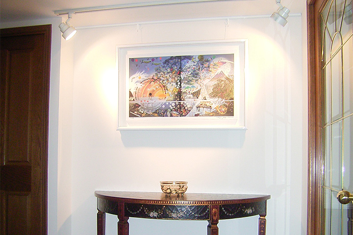 お客様のご希望を叶えるため、リビングには海外建築の伝統を取り入れた格子天井と布団張りの腰壁を採用。ダイニングにはオーダーメイドのバーカウンターを設置し、ご夫婦お気に入りの家具と調和するデザインに仕上げました。
